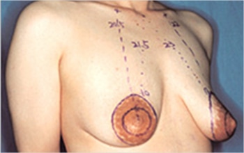 コムロ式マストペクシー(乳房吊り上げ術)は、乳輪周辺に同心円を描くようにデザインし、伸びた 皮膚や皮下組織を切除。