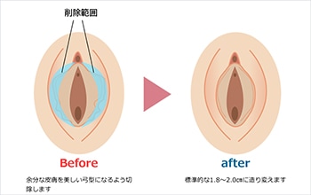また、小陰唇が大きいと小陰唇と大陰唇が密着したままになり、恥垢(分泌物のアカ)が溜まり不潔になりやすく悪臭の原因にもなります。そのため清潔を保つという医学的な見地からも大きすぎる小陰唇を適切な大きさに整えることをおすすめしています。
